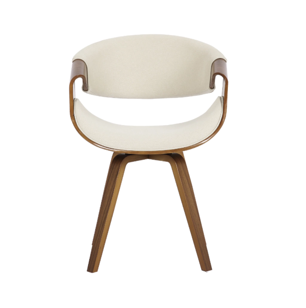 Cadeira em madeira multilaminada • Assento e encosto estofados em poliuretano ou linho • Base giratória em madeira.